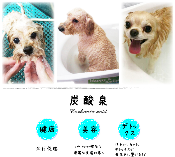 また炭酸泉は、保湿性を損なわずシャンプーだけでは落としにくい汚れを負担なくキレイに落とし、素の被毛と皮膚にリセットします。取り除いた汚れの部分には、保湿成分やトリートメントが浸透しやすく、つやつやサラサラの被毛へ導きます。そして、体内から排出された不要なミネラルを効果的に落とす事で、皮膚トラブルの原因が大幅に軽減され、長生きにも繋がるのです。